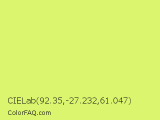 CIELab 92.35,-27.232,61.047 Color is a light lime color and the nearest color is Booger Buster #dde26a. Hex code #dbf56e and RGB value is rgb(219,245,110). In RGB color space, this color is composed of 86% red, 96% green, 43% blue, In CMYK color space, this color is composed of 11% cyan, 0% magenta, 55% yellow , 4% black , In HSL color space, this color has a hue angle of 72° , 87% saturation and 70% lightness.