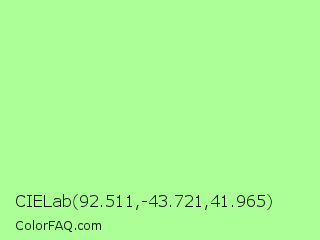 CIELab 92.511,-43.721,41.965 Color is a light green color and the nearest color is Mint Green #98ff98. Hex code #acfe96 and RGB value is rgb(172,254,150). In RGB color space, this color is composed of 67% red, 100% green, 59% blue, In CMYK color space, this color is composed of 32% cyan, 0% magenta, 41% yellow , 0% black , In HSL color space, this color has a hue angle of 107° , 98% saturation and 79% lightness.