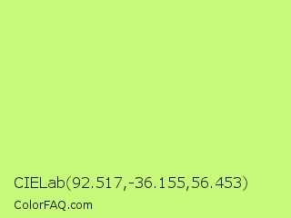 CIELab 92.517,-36.155,56.453 Color is a light green color and the nearest color is Sulu #c1f07c. Hex code #c7fa78 and RGB value is rgb(199,250,120). In RGB color space, this color is composed of 78% red, 98% green, 47% blue, In CMYK color space, this color is composed of 20% cyan, 0% magenta, 52% yellow , 2% black , In HSL color space, this color has a hue angle of 84° , 93% saturation and 73% lightness.