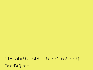 CIELab 92.543,-16.751,62.553 Color is a light yellow color and the nearest color is Manz #eeef78. Hex code #f0f06c and RGB value is rgb(240,240,108). In RGB color space, this color is composed of 94% red, 94% green, 42% blue, In CMYK color space, this color is composed of 0% cyan, 0% magenta, 55% yellow , 6% black , In HSL color space, this color has a hue angle of 60° , 81% saturation and 68% lightness.