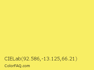 CIELab 92.586,-13.125,66.21 Color is a light yellow color and the nearest color is Candy Corn #fbec5d. Hex code #f8ee64 and RGB value is rgb(248,238,100). In RGB color space, this color is composed of 97% red, 93% green, 39% blue, In CMYK color space, this color is composed of 0% cyan, 4% magenta, 60% yellow , 3% black , In HSL color space, this color has a hue angle of 56° , 91% saturation and 68% lightness.