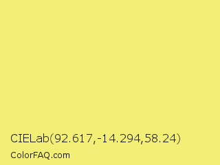 CIELab 92.617,-14.294,58.24 Color is a light yellow color and the nearest color is Sunny #f2f27a. Hex code #f3ef76 and RGB value is rgb(243,239,118). In RGB color space, this color is composed of 95% red, 94% green, 46% blue, In CMYK color space, this color is composed of 0% cyan, 2% magenta, 51% yellow , 5% black , In HSL color space, this color has a hue angle of 58° , 84% saturation and 71% lightness.