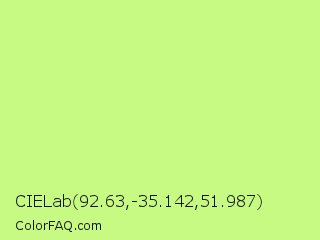 CIELab 92.63,-35.142,51.987 Color is a light green color and the nearest color is Sulu #c1f07c. Hex code #c7fa82 and RGB value is rgb(199,250,130). In RGB color space, this color is composed of 78% red, 98% green, 51% blue, In CMYK color space, this color is composed of 20% cyan, 0% magenta, 48% yellow , 2% black , In HSL color space, this color has a hue angle of 86° , 92% saturation and 75% lightness.