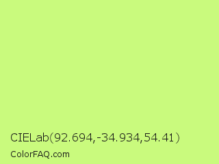CIELab 92.694,-34.934,54.41 Color is a light green color and the nearest color is Sulu #c1f07c. Hex code #c9fa7d and RGB value is rgb(201,250,125). In RGB color space, this color is composed of 79% red, 98% green, 49% blue, In CMYK color space, this color is composed of 20% cyan, 0% magenta, 50% yellow , 2% black , In HSL color space, this color has a hue angle of 84° , 93% saturation and 74% lightness.
