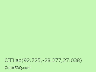 CIELab 92.725,-28.277,27.038 Color is a very light green color and the nearest color is Gossip #d2f8b0. Hex code #c5f8b5 and RGB value is rgb(197,248,181). In RGB color space, this color is composed of 77% red, 97% green, 71% blue, In CMYK color space, this color is composed of 21% cyan, 0% magenta, 27% yellow , 3% black , In HSL color space, this color has a hue angle of 106° , 83% saturation and 84% lightness.