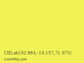 CIELab 92.884,-19.157,71.973 Color is a light yellow color and the nearest color is Candy Corn #fbec5d. Hex code #f0f256 and RGB value is rgb(240,242,86). In RGB color space, this color is composed of 94% red, 95% green, 34% blue, In CMYK color space, this color is composed of 1% cyan, 0% magenta, 64% yellow , 5% black , In HSL color space, this color has a hue angle of 61° , 86% saturation and 64% lightness.