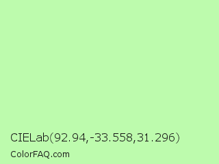 CIELab 92.94,-33.558,31.296 Color is a very light green color and the nearest color is Reef #c9ffa2. Hex code #bdfbad and RGB value is rgb(189,251,173). In RGB color space, this color is composed of 74% red, 98% green, 68% blue, In CMYK color space, this color is composed of 25% cyan, 0% magenta, 31% yellow , 2% black , In HSL color space, this color has a hue angle of 108° , 91% saturation and 83% lightness.