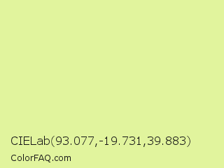 CIELab 93.077,-19.731,39.883 Color is a light lime color and the nearest color is Primrose #edea99. Hex code #e1f49d and RGB value is rgb(225,244,157). In RGB color space, this color is composed of 88% red, 96% green, 62% blue, In CMYK color space, this color is composed of 8% cyan, 0% magenta, 36% yellow , 4% black , In HSL color space, this color has a hue angle of 73° , 80% saturation and 79% lightness.