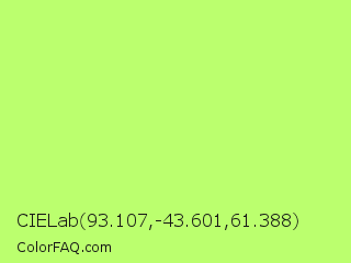 CIELab 93.107,-43.601,61.388 Color is a light green color and the nearest color is Sulu #c1f07c. Hex code #bbff6e and RGB value is rgb(187,255,110). In RGB color space, this color is composed of 73% red, 100% green, 43% blue, In CMYK color space, this color is composed of 27% cyan, 0% magenta, 57% yellow , 0% black , In HSL color space, this color has a hue angle of 88° , 100% saturation and 72% lightness.