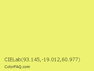 CIELab 93.145,-19.012,60.977 Color is a light yellow color and the nearest color is Manz #eeef78. Hex code #edf371 and RGB value is rgb(237,243,113). In RGB color space, this color is composed of 93% red, 95% green, 44% blue, In CMYK color space, this color is composed of 2% cyan, 0% magenta, 53% yellow , 5% black , In HSL color space, this color has a hue angle of 63° , 84% saturation and 70% lightness.