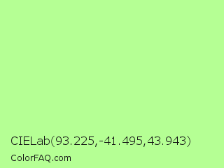 CIELab 93.225,-41.495,43.943 Color is a light green color and the nearest color is Reef #c9ffa2. Hex code #b5ff94 and RGB value is rgb(181,255,148). In RGB color space, this color is composed of 71% red, 100% green, 58% blue, In CMYK color space, this color is composed of 29% cyan, 0% magenta, 42% yellow , 0% black , In HSL color space, this color has a hue angle of 101° , 100% saturation and 79% lightness.