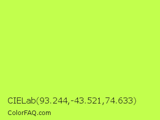 CIELab 93.244,-43.521,74.633 Color is a light green color and the nearest color is Inchworm #b2ec5d. Hex code #c2ff4d and RGB value is rgb(194,255,77). In RGB color space, this color is composed of 76% red, 100% green, 30% blue, In CMYK color space, this color is composed of 24% cyan, 0% magenta, 70% yellow , 0% black , In HSL color space, this color has a hue angle of 81° , 100% saturation and 65% lightness.