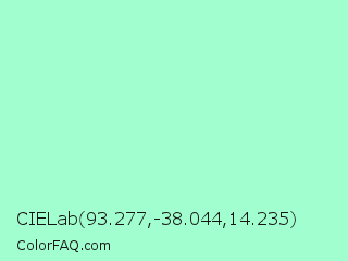 CIELab 93.277,-38.044,14.235 Color is a very light green color and the nearest color is Magic Mint #aaf0d1. Hex code #a1ffcf and RGB value is rgb(161,255,207). In RGB color space, this color is composed of 63% red, 100% green, 81% blue, In CMYK color space, this color is composed of 37% cyan, 0% magenta, 19% yellow , 0% black , In HSL color space, this color has a hue angle of 149° , 100% saturation and 82% lightness.