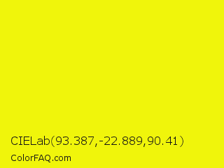 CIELab 93.387,-22.889,90.41 Color is a normal yellow color and the nearest color is Lemon #fde910. Hex code #f0f50b and RGB value is rgb(240,245,11). In RGB color space, this color is composed of 94% red, 96% green, 4% blue, In CMYK color space, this color is composed of 2% cyan, 0% magenta, 96% yellow , 4% black , In HSL color space, this color has a hue angle of 61° , 92% saturation and 50% lightness.
