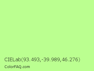 CIELab 93.493,-39.989,46.276 Color is a light green color and the nearest color is Reef #c9ffa2. Hex code #bbff90 and RGB value is rgb(187,255,144). In RGB color space, this color is composed of 73% red, 100% green, 56% blue, In CMYK color space, this color is composed of 27% cyan, 0% magenta, 44% yellow , 0% black , In HSL color space, this color has a hue angle of 97° , 100% saturation and 78% lightness.