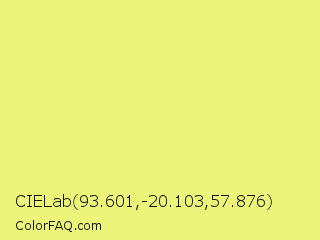 CIELab 93.601,-20.103,57.876 Color is a light yellow color and the nearest color is Manz #eeef78. Hex code #ebf579 and RGB value is rgb(235,245,121). In RGB color space, this color is composed of 92% red, 96% green, 47% blue, In CMYK color space, this color is composed of 4% cyan, 0% magenta, 51% yellow , 4% black , In HSL color space, this color has a hue angle of 65° , 86% saturation and 72% lightness.