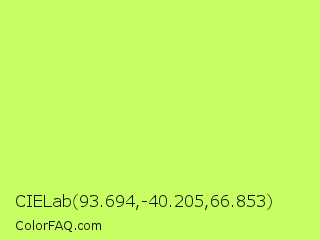 CIELab 93.694,-40.205,66.853 Color is a light green color and the nearest color is Inchworm #b2ec5d. Hex code #c7ff63 and RGB value is rgb(199,255,99). In RGB color space, this color is composed of 78% red, 100% green, 39% blue, In CMYK color space, this color is composed of 22% cyan, 0% magenta, 61% yellow , 0% black , In HSL color space, this color has a hue angle of 82° , 100% saturation and 69% lightness.