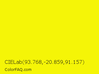 CIELab 93.768,-20.859,91.157 Color is a normal yellow color and the nearest color is Cadmium Yellow #fff600. Hex code #f5f507 and RGB value is rgb(245,245,7). In RGB color space, this color is composed of 96% red, 96% green, 3% blue, In CMYK color space, this color is composed of 0% cyan, 0% magenta, 97% yellow , 4% black , In HSL color space, this color has a hue angle of 60° , 94% saturation and 49% lightness.