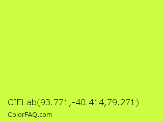 CIELab 93.771,-40.414,79.271 Color is a light lime color and the nearest color is Maximum Green Yellow #d9e650. Hex code #ccff41 and RGB value is rgb(204,255,65). In RGB color space, this color is composed of 80% red, 100% green, 25% blue, In CMYK color space, this color is composed of 20% cyan, 0% magenta, 75% yellow , 0% black , In HSL color space, this color has a hue angle of 76° , 100% saturation and 63% lightness.