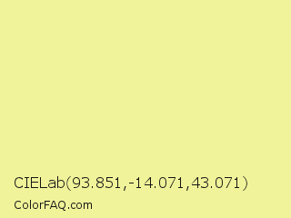 CIELab 93.851,-14.071,43.071 Color is a light yellow color and the nearest color is Primrose #edea99. Hex code #f0f399 and RGB value is rgb(240,243,153). In RGB color space, this color is composed of 94% red, 95% green, 60% blue, In CMYK color space, this color is composed of 1% cyan, 0% magenta, 37% yellow , 5% black , In HSL color space, this color has a hue angle of 62° , 79% saturation and 78% lightness.