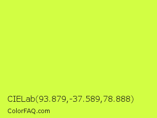 CIELab 93.879,-37.589,78.888 Color is a light lime color and the nearest color is Maximum Green Yellow #d9e650. Hex code #d2fe43 and RGB value is rgb(210,254,67). In RGB color space, this color is composed of 82% red, 100% green, 26% blue, In CMYK color space, this color is composed of 17% cyan, 0% magenta, 74% yellow , 0% black , In HSL color space, this color has a hue angle of 74° , 99% saturation and 63% lightness.