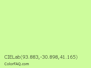 CIELab 93.883,-30.898,41.165 Color is a light green color and the nearest color is Reef #c9ffa2. Hex code #cdfc9c and RGB value is rgb(205,252,156). In RGB color space, this color is composed of 80% red, 99% green, 61% blue, In CMYK color space, this color is composed of 19% cyan, 0% magenta, 38% yellow , 1% black , In HSL color space, this color has a hue angle of 89° , 94% saturation and 80% lightness.