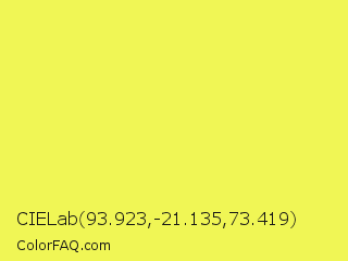 CIELab 93.923,-21.135,73.419 Color is a light yellow color and the nearest color is Canary #f3fb62. Hex code #f0f655 and RGB value is rgb(240,246,85). In RGB color space, this color is composed of 94% red, 96% green, 33% blue, In CMYK color space, this color is composed of 2% cyan, 0% magenta, 65% yellow , 4% black , In HSL color space, this color has a hue angle of 62° , 90% saturation and 65% lightness.