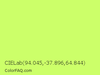 CIELab 94.045,-37.896,64.844 Color is a light green color and the nearest color is Sulu #c1f07c. Hex code #ccff69 and RGB value is rgb(204,255,105). In RGB color space, this color is composed of 80% red, 100% green, 41% blue, In CMYK color space, this color is composed of 20% cyan, 0% magenta, 59% yellow , 0% black , In HSL color space, this color has a hue angle of 80° , 100% saturation and 71% lightness.