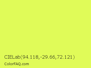 CIELab 94.118,-29.66,72.121 Color is a light yellow color and the nearest color is Canary #f3fb62. Hex code #e0fb58 and RGB value is rgb(224,251,88). In RGB color space, this color is composed of 88% red, 98% green, 35% blue, In CMYK color space, this color is composed of 11% cyan, 0% magenta, 65% yellow , 2% black , In HSL color space, this color has a hue angle of 70° , 95% saturation and 66% lightness.