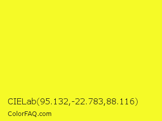 CIELab 95.132,-22.783,88.116 Color is a normal yellow color and the nearest color is Daffodil #ffff31. Hex code #f5fa27 and RGB value is rgb(245,250,39). In RGB color space, this color is composed of 96% red, 98% green, 15% blue, In CMYK color space, this color is composed of 2% cyan, 0% magenta, 84% yellow , 2% black , In HSL color space, this color has a hue angle of 61° , 95% saturation and 57% lightness.