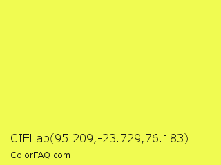 CIELab 95.209,-23.729,76.183 Color is a light yellow color and the nearest color is Starship #ecf245. Hex code #f0fb51 and RGB value is rgb(240,251,81). In RGB color space, this color is composed of 94% red, 98% green, 32% blue, In CMYK color space, this color is composed of 4% cyan, 0% magenta, 68% yellow , 2% black , In HSL color space, this color has a hue angle of 64° , 96% saturation and 65% lightness.