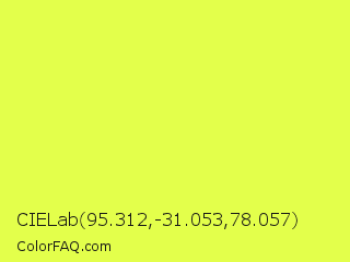 CIELab 95.312,-31.053,78.057 Color is a light yellow color and the nearest color is Starship #ecf245. Hex code #e3ff4b and RGB value is rgb(227,255,75). In RGB color space, this color is composed of 89% red, 100% green, 29% blue, In CMYK color space, this color is composed of 11% cyan, 0% magenta, 71% yellow , 0% black , In HSL color space, this color has a hue angle of 69° , 100% saturation and 65% lightness.