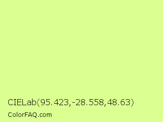 CIELab 95.423,-28.558,48.63 Color is a light green color and the nearest color is Mindaro #e3f988. Hex code #dbff91 and RGB value is rgb(219,255,145). In RGB color space, this color is composed of 86% red, 100% green, 57% blue, In CMYK color space, this color is composed of 14% cyan, 0% magenta, 43% yellow , 0% black , In HSL color space, this color has a hue angle of 80° , 100% saturation and 78% lightness.