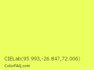 CIELab 95.993,-26.847,72.006 Color is a light yellow color and the nearest color is Canary #f3fb62. Hex code #ebff5e and RGB value is rgb(235,255,94). In RGB color space, this color is composed of 92% red, 100% green, 37% blue, In CMYK color space, this color is composed of 8% cyan, 0% magenta, 63% yellow , 0% black , In HSL color space, this color has a hue angle of 67° , 100% saturation and 68% lightness.