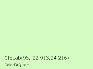 CIELab 95,-22.913,24.216 Color is a very light green color and the nearest color is Tea Green #d0f0c0. Hex code #d5fcc1 and RGB value is rgb(213,252,193). In RGB color space, this color is composed of 84% red, 99% green, 76% blue, In CMYK color space, this color is composed of 15% cyan, 0% magenta, 23% yellow , 1% black , In HSL color space, this color has a hue angle of 100° , 91% saturation and 87% lightness.