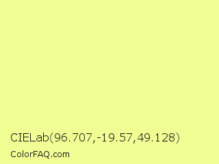 CIELab 96.707,-19.57,49.128 Color is a light yellow color and the nearest color is Jonquil #eeff9a. Hex code #f1fe94 and RGB value is rgb(241,254,148). In RGB color space, this color is composed of 95% red, 100% green, 58% blue, In CMYK color space, this color is composed of 5% cyan, 0% magenta, 42% yellow , 0% black , In HSL color space, this color has a hue angle of 67° , 98% saturation and 79% lightness.