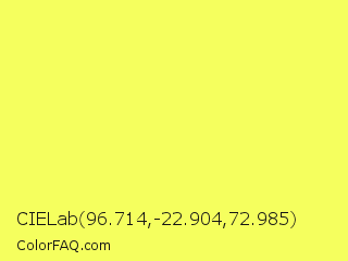 CIELab 96.714,-22.904,72.985 Color is a light yellow color and the nearest color is Canary #f3fb62. Hex code #f5ff5e and RGB value is rgb(245,255,94). In RGB color space, this color is composed of 96% red, 100% green, 37% blue, In CMYK color space, this color is composed of 4% cyan, 0% magenta, 63% yellow , 0% black , In HSL color space, this color has a hue angle of 64° , 100% saturation and 68% lightness.
