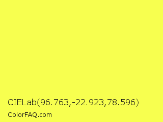 CIELab 96.763,-22.923,78.596 Color is a light yellow color and the nearest color is Lemon Yellow #fff44f. Hex code #f7ff4f and RGB value is rgb(247,255,79). In RGB color space, this color is composed of 97% red, 100% green, 31% blue, In CMYK color space, this color is composed of 3% cyan, 0% magenta, 69% yellow , 0% black , In HSL color space, this color has a hue angle of 63° , 100% saturation and 65% lightness.