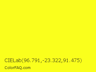 CIELab 96.791,-23.322,91.475 Color is a normal yellow color and the nearest color is Daffodil #ffff31. Hex code #faff1c and RGB value is rgb(250,255,28). In RGB color space, this color is composed of 98% red, 100% green, 11% blue, In CMYK color space, this color is composed of 2% cyan, 0% magenta, 89% yellow , 0% black , In HSL color space, this color has a hue angle of 61° , 100% saturation and 55% lightness.