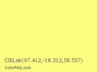 CIELab 97.412,-18.312,58.557 Color is a light yellow color and the nearest color is Dolly #f9ff8b. Hex code #faff82 and RGB value is rgb(250,255,130). In RGB color space, this color is composed of 98% red, 100% green, 51% blue, In CMYK color space, this color is composed of 2% cyan, 0% magenta, 49% yellow , 0% black , In HSL color space, this color has a hue angle of 62° , 100% saturation and 75% lightness.