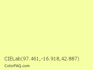 CIELab 97.461,-16.918,42.887 Color is a very light yellow color and the nearest color is Milan #faffa4. Hex code #f5ffa3 and RGB value is rgb(245,255,163). In RGB color space, this color is composed of 96% red, 100% green, 64% blue, In CMYK color space, this color is composed of 4% cyan, 0% magenta, 36% yellow , 0% black , In HSL color space, this color has a hue angle of 67° , 100% saturation and 82% lightness.