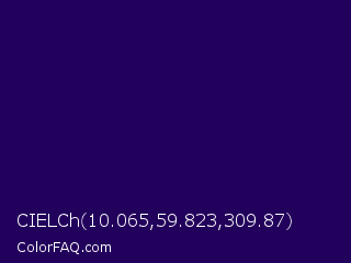 CIELCh 10.065,59.823,309.87 Color is a very dark violet color and the nearest color is Cherry Pie #2a0359. Hex code #22015c and RGB value is rgb(34,1,92). In RGB color space, this color is composed of 13% red, 0% green, 36% blue, In CMYK color space, this color is composed of 63% cyan, 99% magenta, 0% yellow , 64% black , In HSL color space, this color has a hue angle of 262° , 98% saturation and 18% lightness.