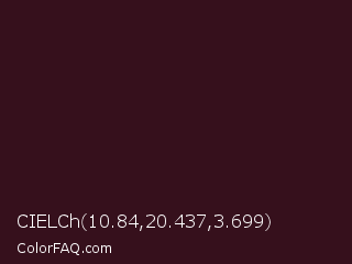 CIELCh 10.84,20.437,3.699 Color is a very dark rose color and the nearest color is Tamarind #341515. Hex code #36101c and RGB value is rgb(54,16,28). In RGB color space, this color is composed of 21% red, 6% green, 11% blue, In CMYK color space, this color is composed of 0% cyan, 70% magenta, 48% yellow , 79% black , In HSL color space, this color has a hue angle of 341° , 54% saturation and 14% lightness.
