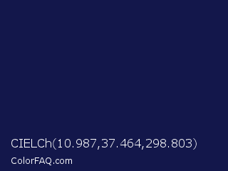CIELCh 10.987,37.464,298.803 Color is a very dark blue color and the nearest color is Bunting #151f4c. Hex code #13174b and RGB value is rgb(19,23,75). In RGB color space, this color is composed of 7% red, 9% green, 29% blue, In CMYK color space, this color is composed of 75% cyan, 69% magenta, 0% yellow , 71% black , In HSL color space, this color has a hue angle of 236° , 60% saturation and 18% lightness.