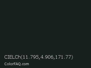 CIELCh 11.795,4.906,171.77 Color is a very dark green color and the nearest color is Dark Jungle Green #1a2421. Hex code #18211e and RGB value is rgb(24,33,30). In RGB color space, this color is composed of 9% red, 13% green, 12% blue, In CMYK color space, this color is composed of 27% cyan, 0% magenta, 9% yellow , 87% black , In HSL color space, this color has a hue angle of 160° , 16% saturation and 11% lightness.