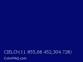 CIELCh 11.855,68.452,304.728 Color is a dark blue color and the nearest color is Arapawa #110c6c. Hex code #030970 and RGB value is rgb(3,9,112). In RGB color space, this color is composed of 1% red, 4% green, 44% blue, In CMYK color space, this color is composed of 97% cyan, 92% magenta, 0% yellow , 56% black , In HSL color space, this color has a hue angle of 237° , 95% saturation and 23% lightness.