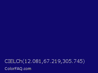 CIELCh 12.081,67.219,305.745 Color is a dark indigo color and the nearest color is Arapawa #110c6c. Hex code #11086e and RGB value is rgb(17,8,110). In RGB color space, this color is composed of 7% red, 3% green, 43% blue, In CMYK color space, this color is composed of 85% cyan, 93% magenta, 0% yellow , 57% black , In HSL color space, this color has a hue angle of 245° , 86% saturation and 23% lightness.