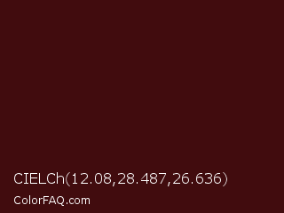 CIELCh 12.08,28.487,26.636 Color is a very dark red color and the nearest color is Aubergine #3b0910. Hex code #410c0e and RGB value is rgb(65,12,14). In RGB color space, this color is composed of 25% red, 5% green, 5% blue, In CMYK color space, this color is composed of 0% cyan, 82% magenta, 78% yellow , 75% black , In HSL color space, this color has a hue angle of 358° , 69% saturation and 15% lightness.