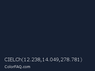 CIELCh 12.238,14.049,278.781 Color is a very dark blue color and the nearest color is Mirage #161928. Hex code #162033 and RGB value is rgb(22,32,51). In RGB color space, this color is composed of 9% red, 13% green, 20% blue, In CMYK color space, this color is composed of 57% cyan, 37% magenta, 0% yellow , 80% black , In HSL color space, this color has a hue angle of 219° , 40% saturation and 14% lightness.