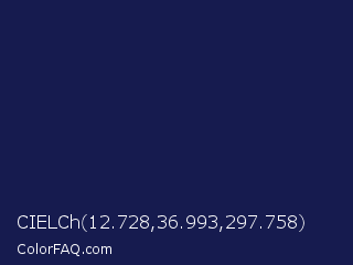 CIELCh 12.728,36.993,297.758 Color is a very dark blue color and the nearest color is Bunting #151f4c. Hex code #161b4f and RGB value is rgb(22,27,79). In RGB color space, this color is composed of 9% red, 11% green, 31% blue, In CMYK color space, this color is composed of 72% cyan, 66% magenta, 0% yellow , 69% black , In HSL color space, this color has a hue angle of 235° , 56% saturation and 20% lightness.